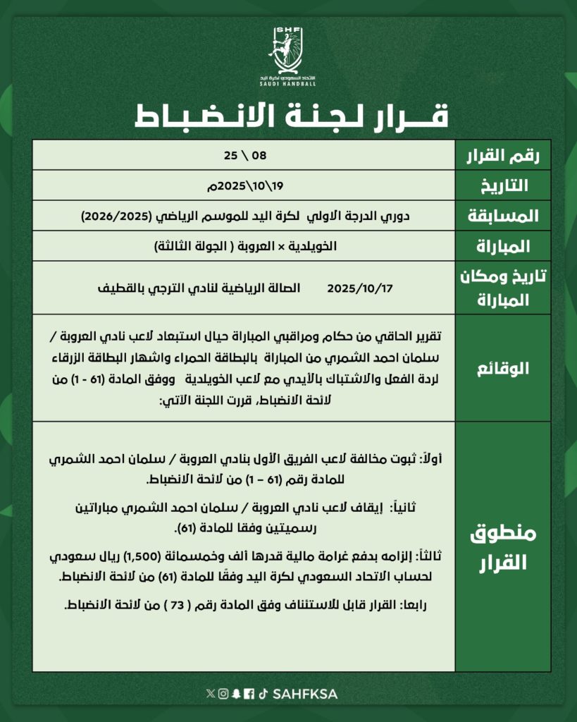 إجراءات لجنة الإستئناف بالإتحاد السعودي لكرة اليد 2023