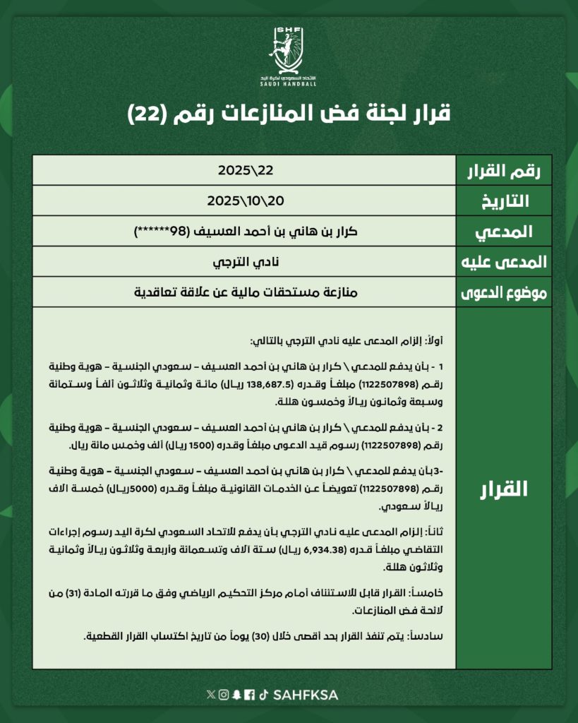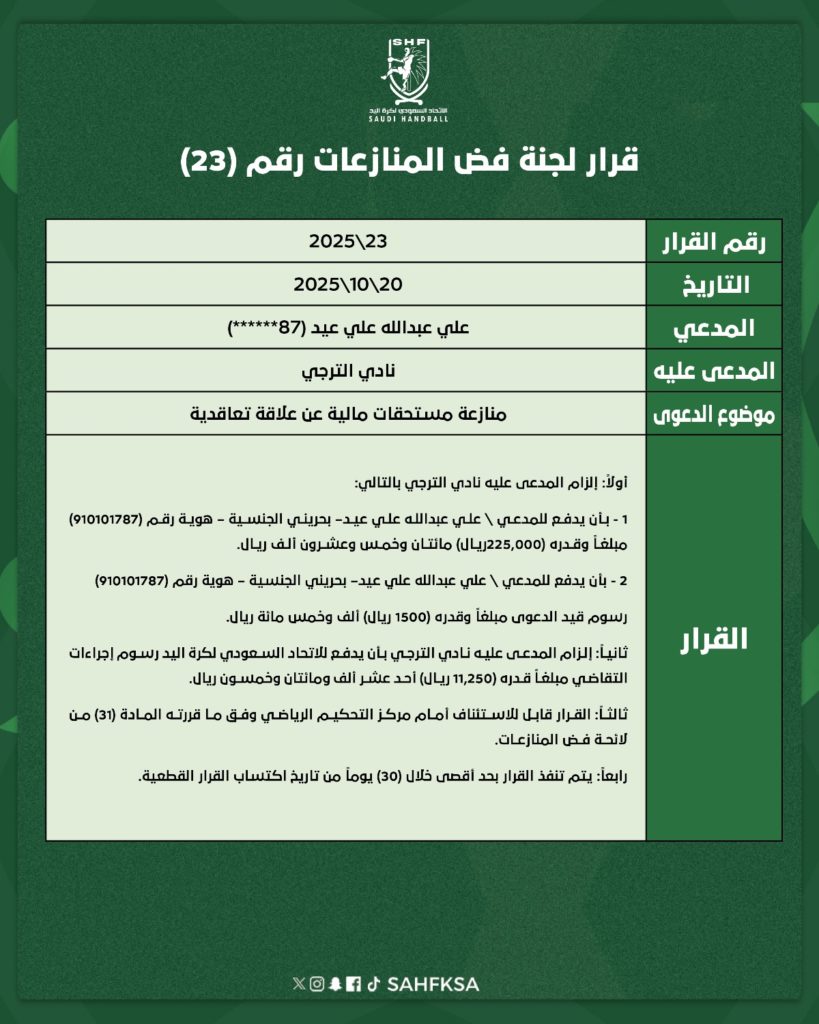 إجراءات لجنة الإستئناف بالإتحاد السعودي لكرة اليد 2023