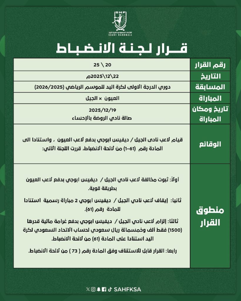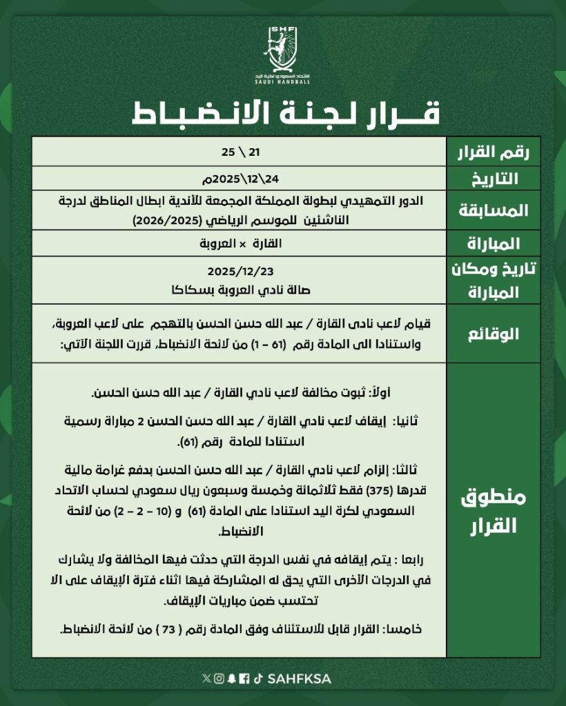 حقق فريق الحزم انتصارًا ثمينًا على نظيره مضر بنتيجة (29–27) ضمن منافسات الجولة الرابعة من بطولة الدوري الممتاز لكرة اليد لدرجة الشباب للموسم الرياضي 2025-2026م، في واحدة من أبرز مفاجآت الجولة، ليخطف الحزم اول نقطتين له في سلم الترتيب.