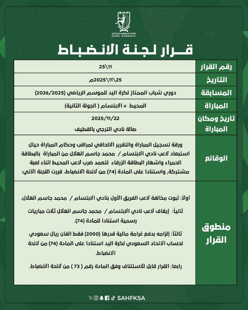 وفي السياق ذاته، نال الحكمان السعوديان مشاري الحويل وحسن حمزة الشارة القارية ضمن نفس الدورة، في خطوة تعكس حرص الاتحاد السعودي لكرة اليد على دعم الكفاءات الشابة وتمكينها من الوصول إلى الشارة الدولية والمشاركة في كبرى البطولات العالمية.