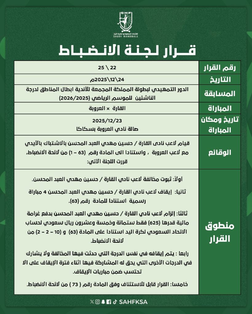 حقق فريق الحزم انتصارًا ثمينًا على نظيره مضر بنتيجة (29–27) ضمن منافسات الجولة الرابعة من بطولة الدوري الممتاز لكرة اليد لدرجة الشباب للموسم الرياضي 2025-2026م، في واحدة من أبرز مفاجآت الجولة، ليخطف الحزم اول نقطتين له في سلم الترتيب.